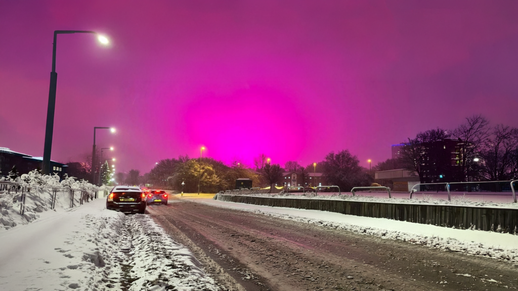 Storm Goretti created the perfect conditions for the light to behave differently. Thick cloud cover and falling snow acted like a massive reflective surface over the city, bouncing the light back down instead of allowing it to fade into the atmosphere. Snow particles scattered shorter blue wavelengths while allowing the red and pink tones to dominate, resulting in the dramatic glow that blanketed Birmingham.